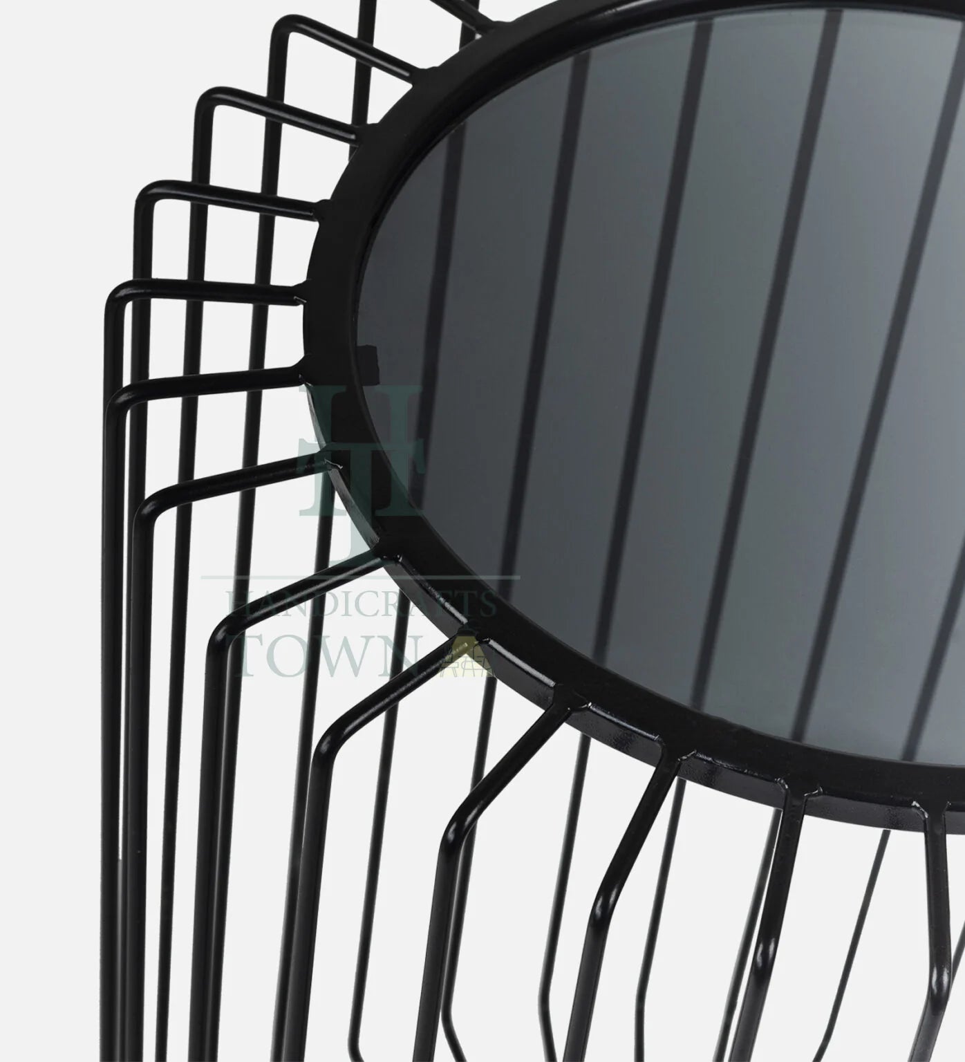 A metal cage side table with a glass top is a type of furniture that combines functionality and style. It features a metal cage base in black, which provides an open and airy design, while the glass top provides a smooth and elegant surface.