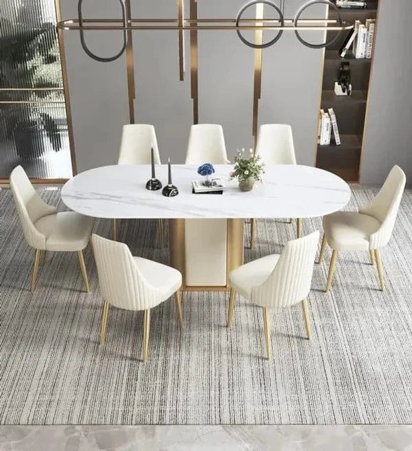 At the heart of the Octavian table lies a stunning white composite marble top, its smooth, cool surface providing a canvas for culinary creations and conversation. This exquisite top is perfectly complemented by a robust stainless steel frame, ensuring durability and a lasting impression. The unique rectangular metal base stand, finished in a pristine white, anchors the table with a sense of modern architectural flair, creating a striking visual contrast against the warm tones of your dining space. The Octavian dining set includes eight meticulously upholstered chairs, each designed for both comfort and style. The plush seating invites you to linger longer, while the sleek metal stand cone-shaped legs echo the table's contemporary aesthetic. With a generous diameter of 78x36x30 inches, the Octavian table provides ample space for hosting dinner parties, family gatherings, and festive celebrations. Its expansive surface ensures that every guest feels comfortable and included, making it the perfect setting for creating lasting memories.