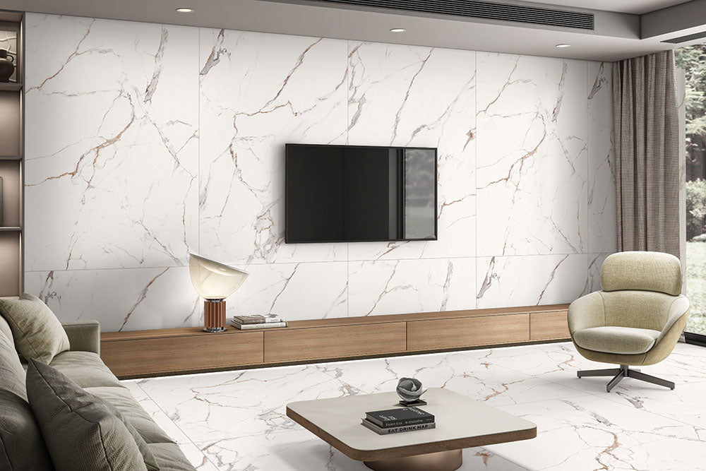 WHITE marble-look surface featuring soft cream undertones with natural, irregular veining. The design offers a warm, neutral aesthetic suited for modern flooring, wall cladding, kitchen spaces, and premium interior applications. Its polished stone texture adds depth and an elegant, high-end finish to any environment.